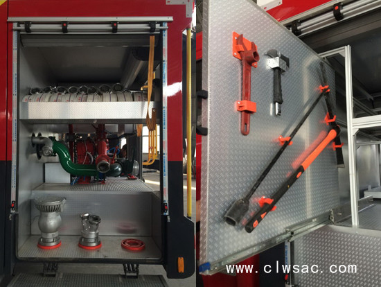 消防车整车流线形设计,外观新颖,机动灵活,经济实用,内部器材架分隔材料均用高强度铝合金型材,美观大方。各种器材放置合理,并用特制专用夹具固定