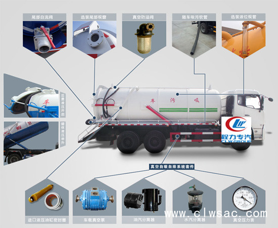 该车采用东风后双桥底盘系列底盘,加装真空吸污泵、压力罐体、液压部分、管网系统、真空压力表、油水分离器、视污窗、洗手装置等改装而成,安装康明斯等发动机,排放达到国五标准。