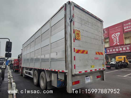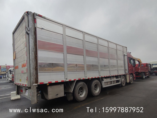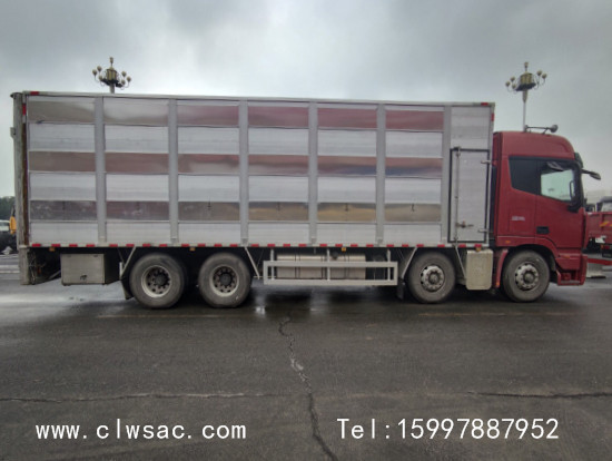 程力福田欧曼前四后八畜禽运输车装车,改装要求:箱体内为全铝合金保温结构,外部部分玻璃钢饰板,厢体采用全封闭框架结构设计,质量轻、强度高、防锈蚀性强;厢体外层采用保温材质,顶部采用玻璃钢,中间夹层为保温材质,有效避免高温传导,控制厢体内部温度;