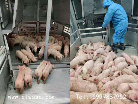 5.进出通道。后门通过液压系统自动展开形成仔猪进出箱体的通道,设有护栏,电动尾部升降装卸平台,手动和无线遥控操作系统,内部双通道,便于装卸和清洗。