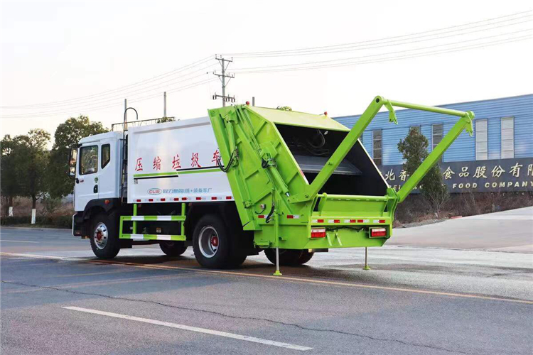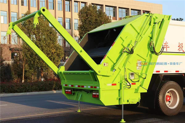 湖北程力公司生产的东风D9多利卡压缩垃圾车尾部上料机构选装摆臂翻转装置,适用于小区,学校,工厂以及小型垃圾站收集地面地下摆放的摆臂式垃圾箱,