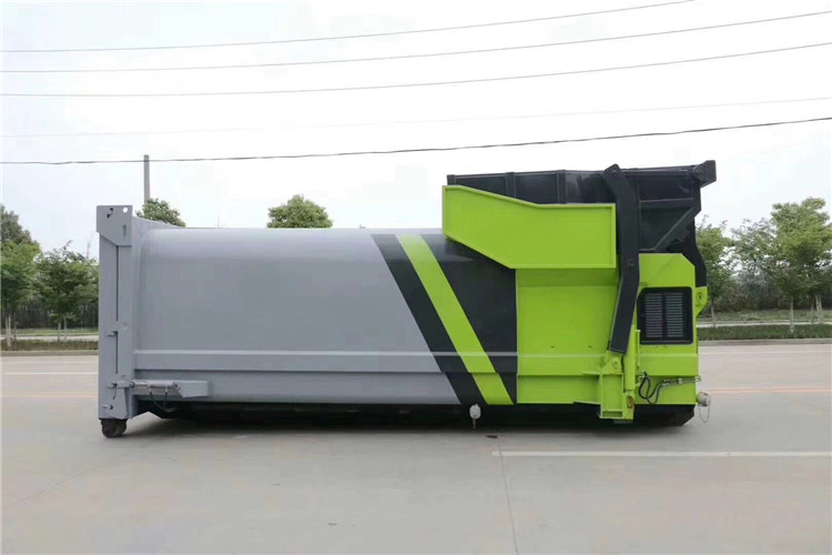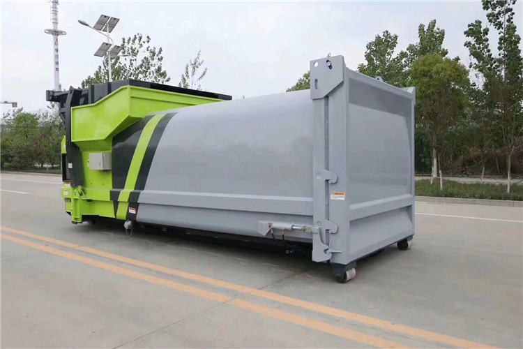 在日常作业中可将车载垃圾箱放置到各个垃圾收集站,待垃圾收集满后,该车可直接开赴至垃圾收集站,通过液压系统的操控,可将垃圾车后座上加装的勾臂装置放下,挂住站内的垃圾箱前端连接点,将垃圾箱拉至车体的后座上,将垃圾运送至垃圾处理站内,进行自卸式倾倒。