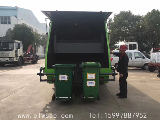 2、压缩垃圾车可选装垃圾桶挂桶液压翻转机构,适用于 120 升、240 升的塑料垃圾桶和350升的金属垃圾桶,也可选装翻斗、摆臂等装载垃圾方式。